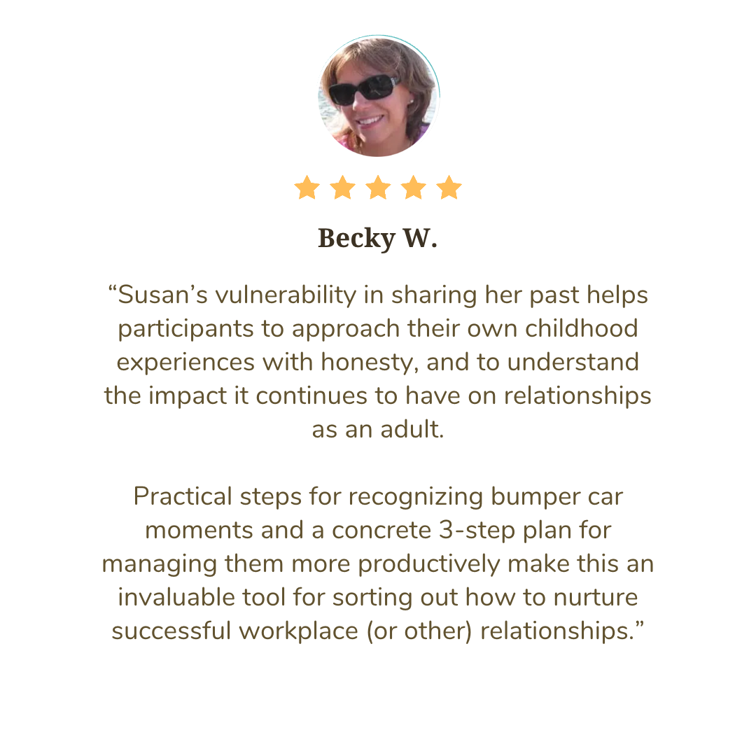 Take the necessary steps to break free from self-limiting beliefs and behavior patterns that served you in the past but weigh you down in your career. Learn how to confidently navigate Bumper Car Moments® in your professional life, and discover how to use the workplace as your very own lab for emotional healing.